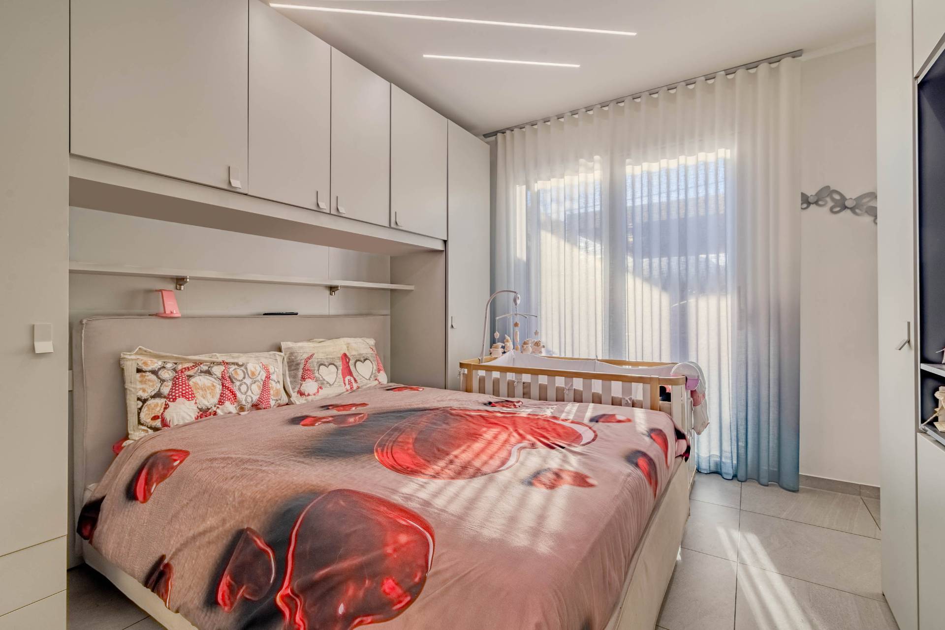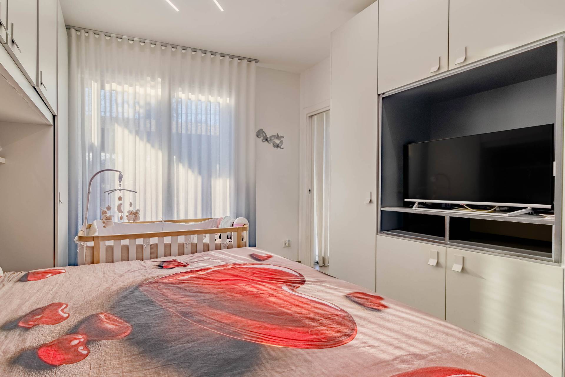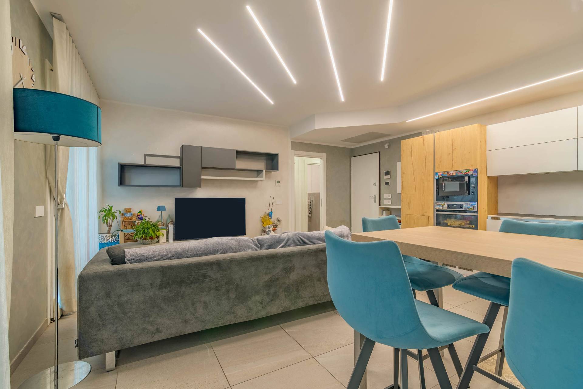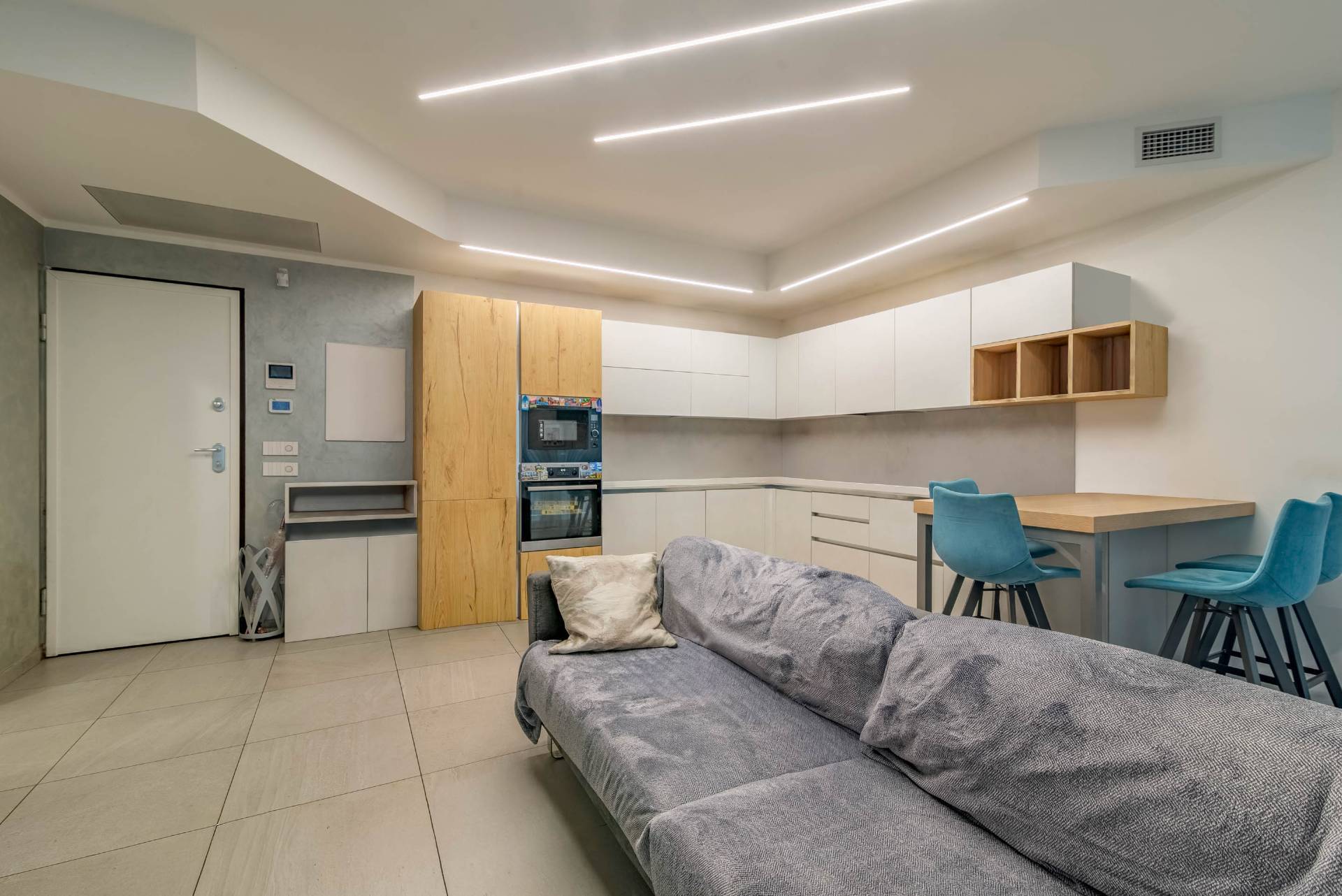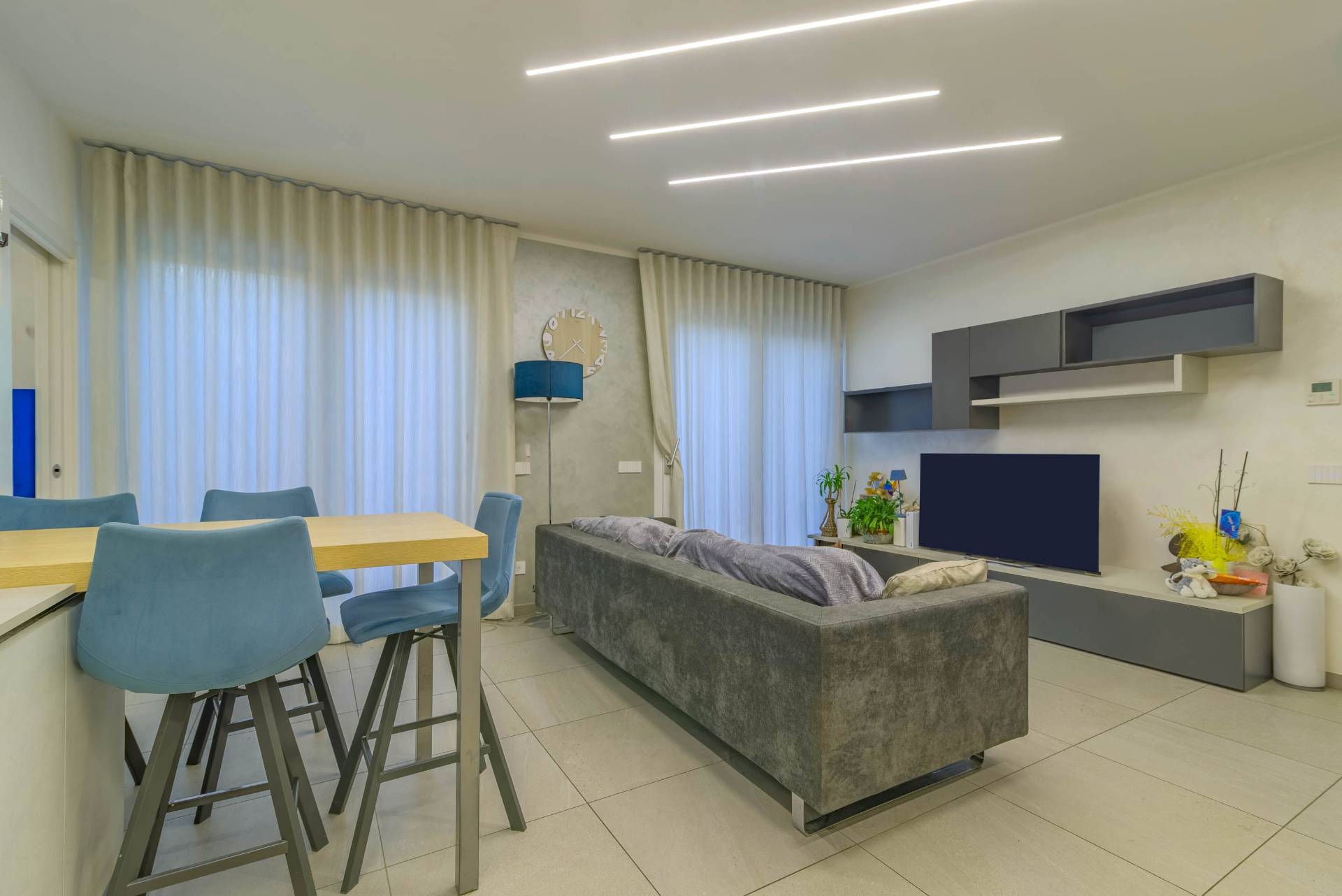 Composto da un luminoso soggiorno con cucina a vista, due camere e doppi servizi.
